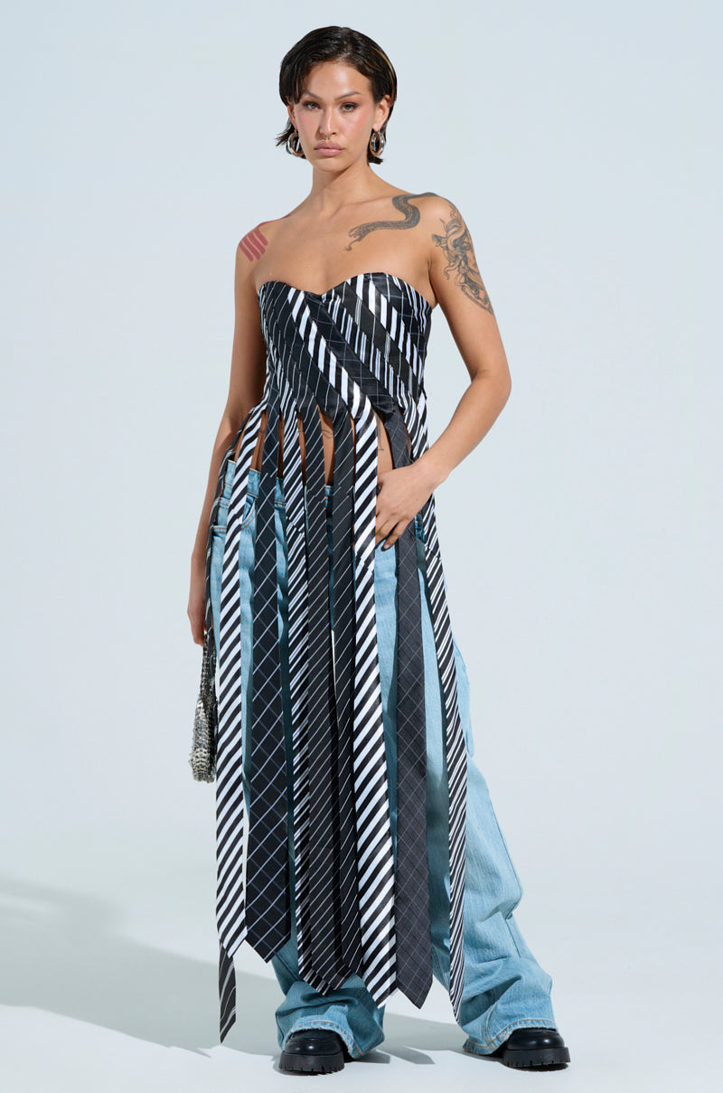 Mixing work and pleasure has never been easier in The AWNIS Label All Work And No Play Tie Detail Corset Top. This unique business casual top features a strapless sweetheart neckline with inner elastic trim. built-in bust cups. an assortment of cascading striped ties that traverse the whole body on the front panel to create a unique patchwork look. a sheer mesh back. a metallic back zip closure. and a satiny inner lining. Pair with baggy denim and patent leather loafers for a sleek finish.