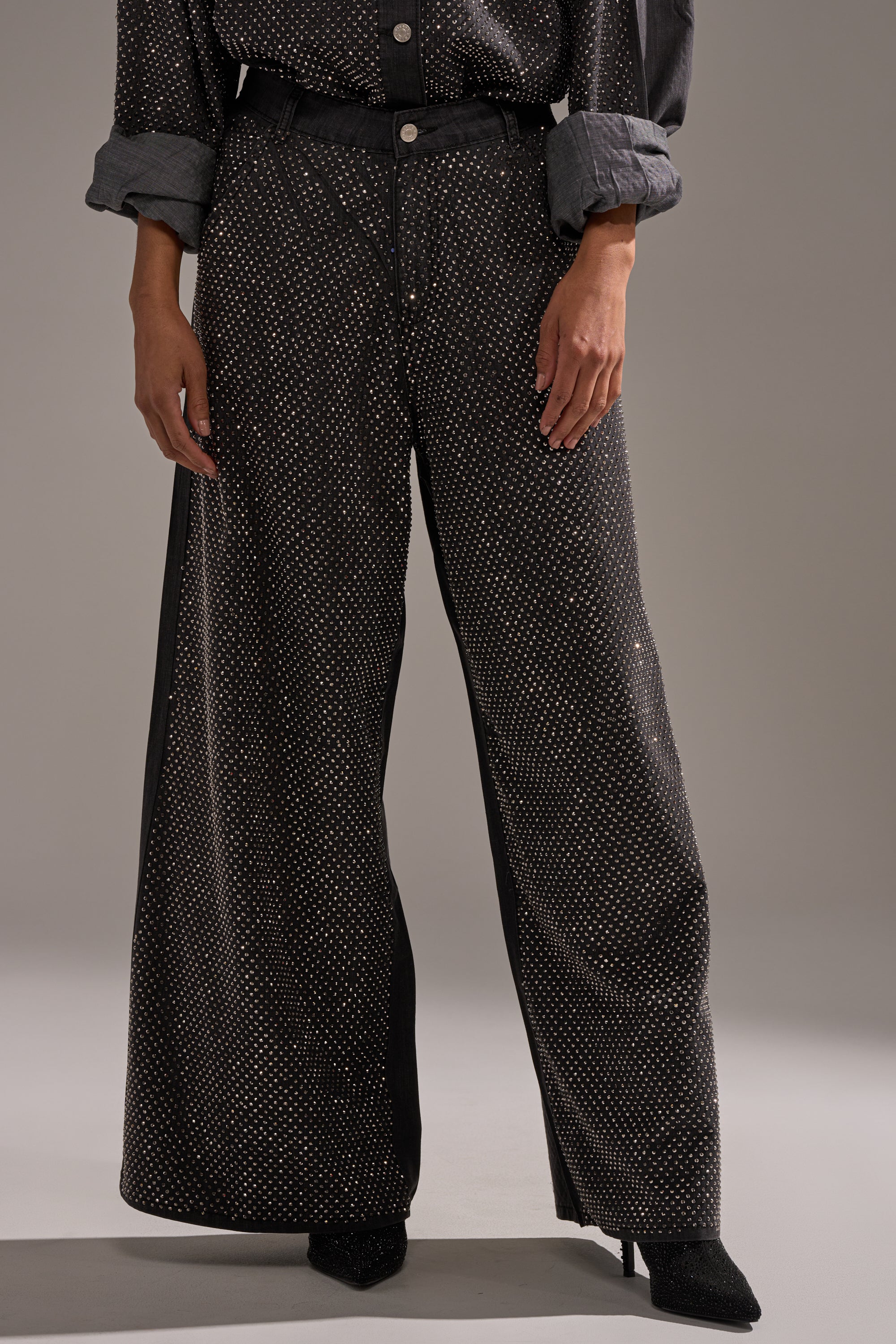 Sparkle the night away in The AKIRA Label Bling Bling Denim Relaxed Pant In Black. Crafted from a non-stretch dark-wash denim. this glamorous bottom boasts a high-rise fit. functional belt loops. two waist pockets. a button-zip front closure. and a wide-leg silhouette. The front is completely adorned in glittering. rhinestone embellishments. Pair with the matching AKIRA Label Bling Bling Denim Button Down Top In Black. stiletto booties. and a silver clutch for a luxurious finish.