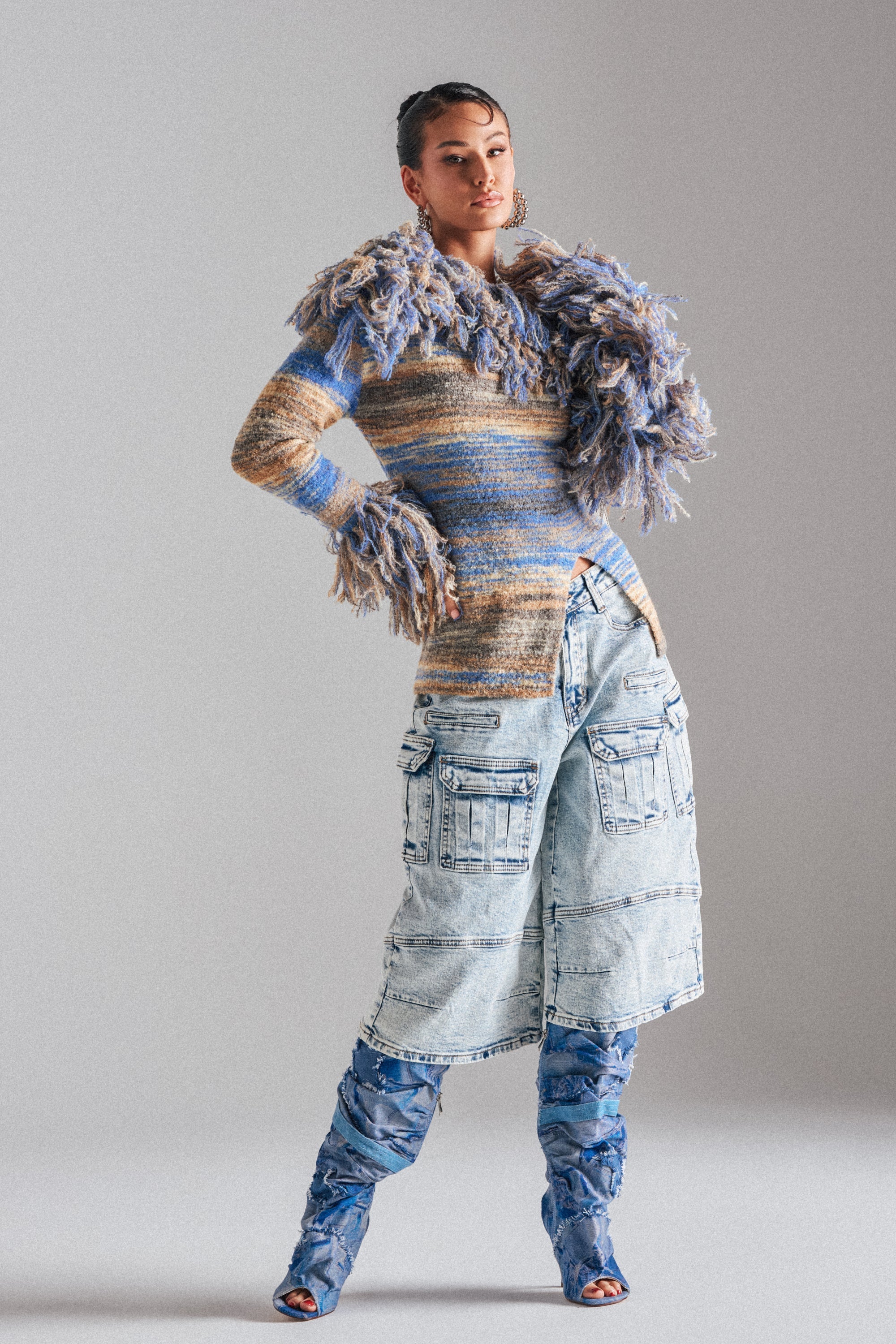 Acid-wash. semi-stretch denim with a classic bermuda silhouette and cargo-inspired detailing. It features a high-rise fit. functional belt loops. a classic five-pocket design with additional cargo-style pockets lining the upper thighs. and reinforced seam paneling. Complete with a classic front zip fly with a button closure. Style with a baby tee and platform sneakers to elevate your casual days.