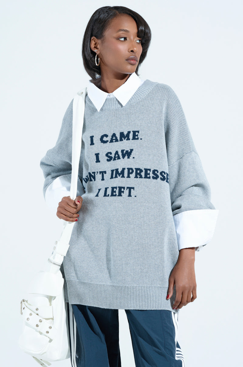 Have no regrets in The AWNIS Label Never Going Back Oversized Sweater. This sassy piece is crafted from a cozy woven knit base and features a ribbed knit crew neckline. long sleeves with elasticized ribbed cuffs. a coordinating waistband. and the phrase “I came. I saw. I wasn't impressed. I left” across the front. Complete with an oversized. longline silhouette. and an easy. pull-on fit. Pair with baggy jeans. frilly ankle socks. and leather loafers for a finished look.