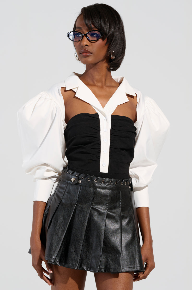 Let the good times roll in The AWNIS Label This Life Bodysuit. This sophisticated piece is crafted from two fabrications including a sleek poplin-inspired base and a stretchy. cotton blend fabric. It features a color block design with a poplin notch lapel collar. long sleeves with subtle ruched detailing at the shoulders that creates a puffed silhouette and button cuffs. cut out detailing at the upper chest. a coordinating button down front placket. and an exposed back. This piece also boasts a contrast. attached bodysuit with flattering ruched detailing. and a cheeky thong bottom with snap gusset closures. Pair with linen pants. stiletto heels. and a clutch for a finished look.
