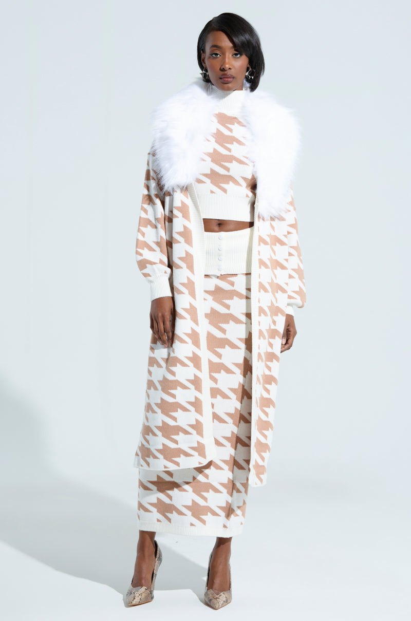 Born to be a lover girl in The AWNIS Label Type Of Love Cardigan. This cozy style is crafted from a stretchy knit fabrication and features a two-tone houndstooth pattern throughout. a plush. removable oversized faux fur collar. long sleeves with ribbed knit cuffs. and an open front with coordinating ribbed knit trim. Complete with a longline silhouette. and an easy. slip-on fit. Pair atop a mohair sweater. flared denim. and stiletto boots for a chic finish.