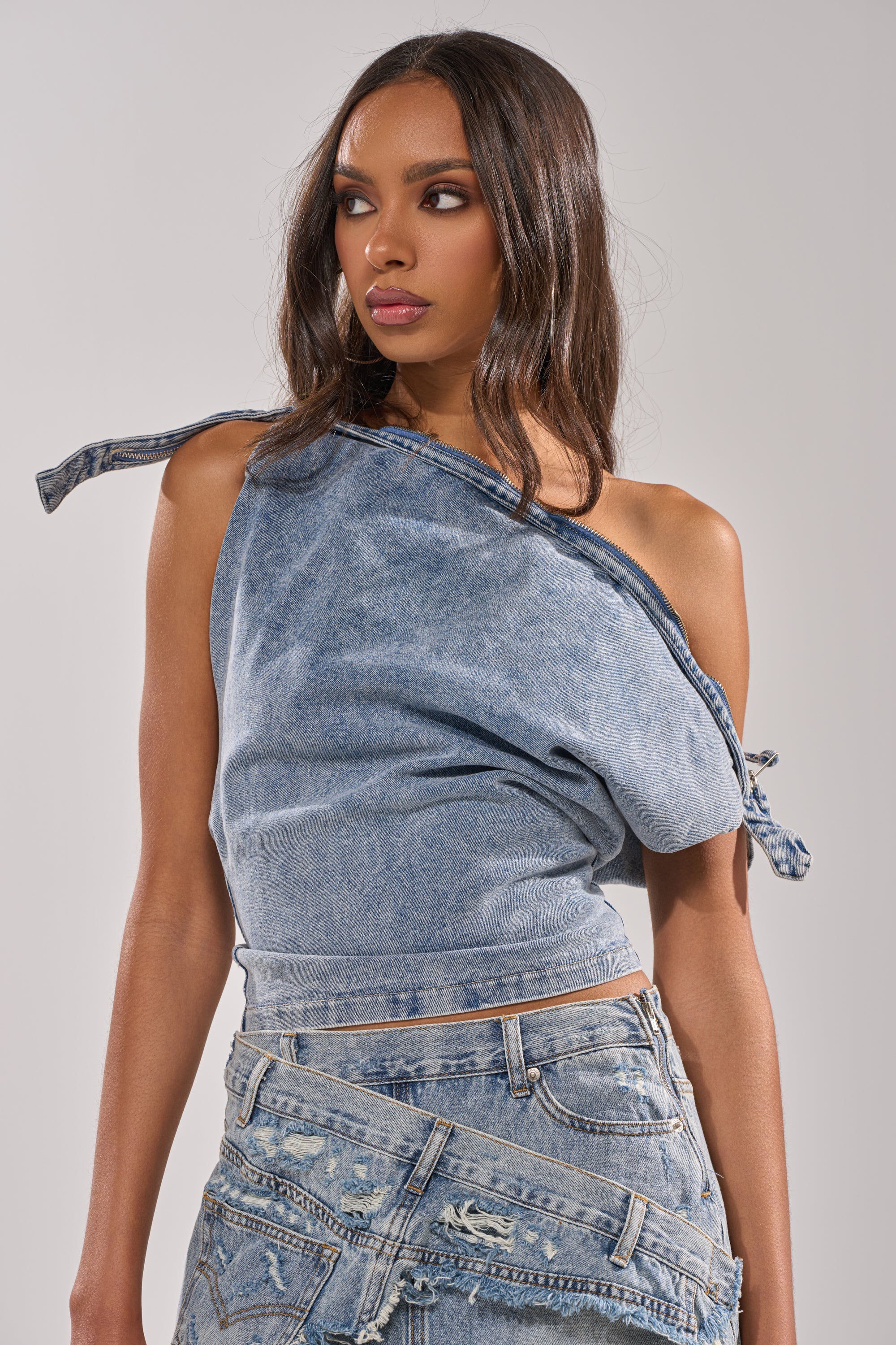 Trendy and body-contouring denim off-the-shoulder top designed for streetwear with a modern. fashion-forward edge. Crafted from soft. stretch denim. this fitted piece features a wide double-zippered neckline with drape tie detailing for a customizable. slouched off-shoulder look. The structured seams and cropped length with a back zipper enclosure create a flattering. waist-defining shape while maintaining comfort and flexibility. Perfect for pairing with high-waisted jeans. skirts. or statement bottoms. this chic denim top is ideal for elevated casual wear. night-out styling. or contemporary streetwear looks.
